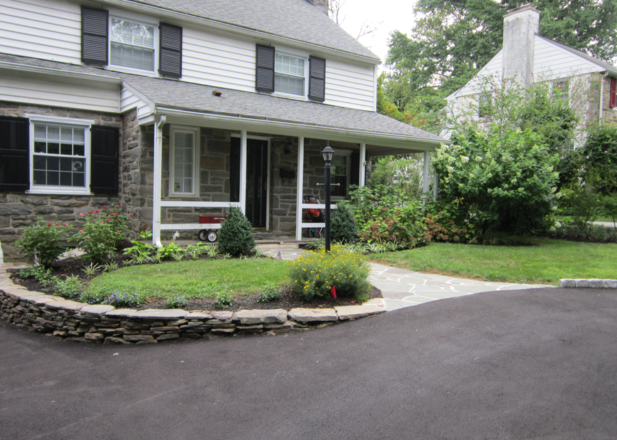 Belgian block, boulders, low dry-stack stone, snapped bluestone curbing / edging
